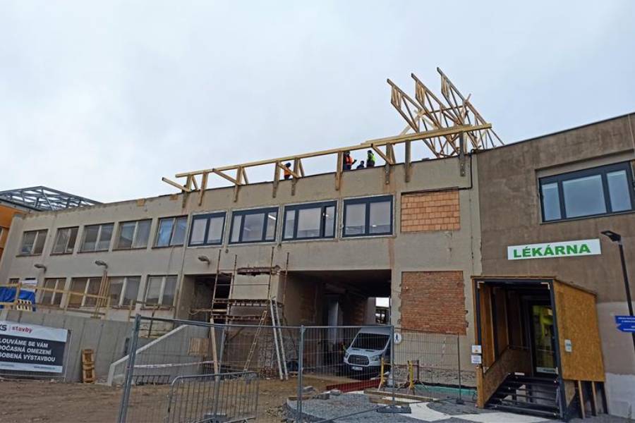 „Stavba je v současně době ve fázi přípravy rekonstrukce prostřední části střechy. Během opravy je nutné kompletně odstranit původní skladbu střechy a dostat se až na stropní podklad. Tato fáze bude náročná, protože se odehrává přímo nad prostory nově vystavěných laboratoří,“ vysvětlil technický náměstek novoměstské nemocnice Jiří Drdla.