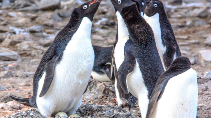 Když tučňáci dokončili stavbu hnízd a samice snesla dvě nebo tři vajíčka, listopad už se chýlí ke konci. Během měsíce, který uplynul od chvíle, kdy opustili moře, žádný z nich nic nejedl. Žili pouze z tukových zásob v těle. Pochopitelně je nedostatek potravy citelnější pro samici, která za tu dobu zhubla až o třetinu. Samec nyní přebírá péči o vejce – položí se na ně hrudí a břichem a zahřívá je, zatímco jeho družka se vrací k moři. Zůstává v něm asi dva týdny, během nichž se nenasytně krmí, dokud opět neztloustne. Její potravou je hlavně krill – malí, garnátům podobní korýši z řádu krunýřovců. Mezitím na hnízdišti hlídá samec vajíčka před chaluhami (velcí draví mořští ptáci) i konkurenty z vlastních řad. Octne-li se totiž tučňák v situaci, kdy postrádá partnera, nijak to neoslabí jeho rodičovský pud. Je tak stále připraven přisvojit si cizí potomstvo.