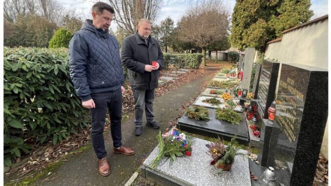 TŘEBÍČ – Starosta Třebíče Pavel Pacal a místostarosta Miloš Hrůza položili v pátek 16. února květiny na hrob Antonína Kaliny na Olšanských hřbitovech v Praze. Třebíčský rodák by právě v těchto dnech oslavil 122. narozeniny.