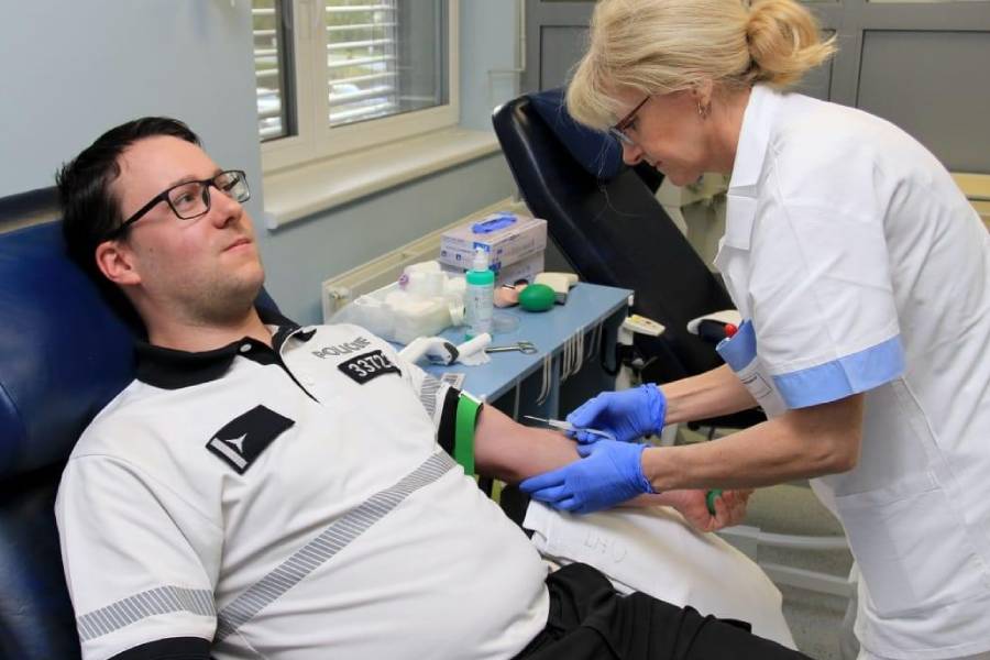 PELHŘIMOV – Desítka policistů z pelhřimovského dopravního inspektorátu darovala v úterý 23. dubna hromadně krev. Společně navštívili transfúzní oddělení nemocnice v Pelhřimově. Polovina z nich byli prvodárci.