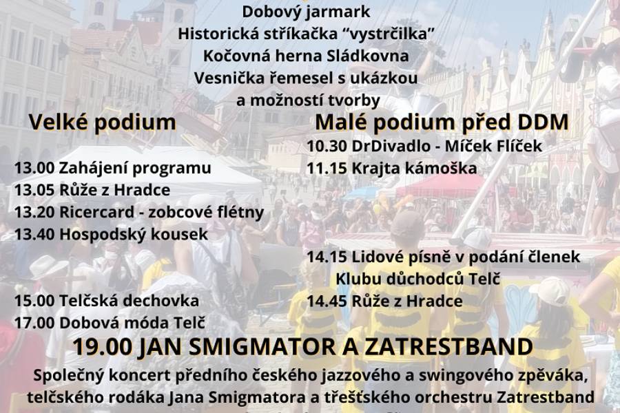 Slavnosti vyvrcholí v 19 hodin večer koncertem předního českého jazzového a swingového zpěváka a telčského rodáka Jana Smigmatora a třešťského orchestru Zatrestband pod vedením Petra Píši.