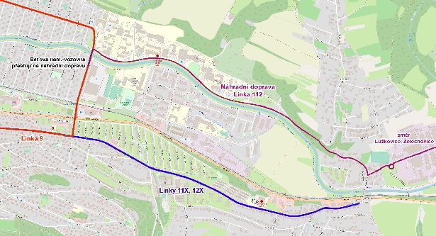 Trolejbusy na linkách č. 11 a 12 vyjedou s označením 11X a 12X. Všechny spoje skončí mimořádně již na točně Příluky, protože křižovatka ulic Pančava a Vizovická nebude průjezdná.