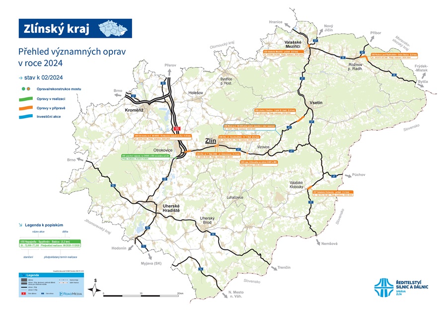 Aktuálně se připravuje zahájení soutěže na zhotovitele opravy silnice I/35 mezi obcemi Zašová a Střítež s předpokládaným termínem realizace v první polovině letošního roku. Brzy se vypíše soutěž také na zhotovitele 2. etapy opravy povrchu silnice mezi Liptálem a Lhotou u Vsetína. „Jde o navazující úsek v délce 2,4 kilometru. První etapu opravy jsme již dokončili v loňské stavební sezóně. Během realizace obou zmíněných akcí předpokládáme vedení provozu kyvadlově na semafory. Přesné termíny zahájení prací včas upřesníme po podpisu smlouvy se zhotoviteli obou akcí,“ přiblížila Trubelíková