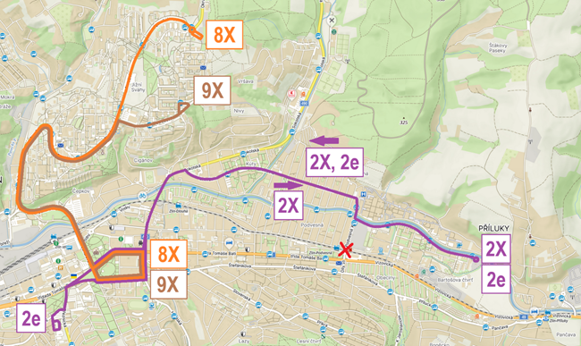 Dopravní obslužnost vynechaného úseku původní linky 8 (Dlouhá, Cigánov, tř. 2. května, Baťova nemocnice) zajistí cestujícím ve stejných odjezdových časech zvláštní posilová linka 2e, která bude vedena z obratiště Sportovní hala na točnu Bartošova čtvrť. Kromě ní pojede na Bartošovu čtvrť ještě linka 2X z Malenovic. V úterý 2. dubna bude ve vybrané časy ráno posílena linka 2X v úseku Malenovice-Centro – Školní – Bartošova čtvrť a zpět a také linka 1 v úseku Příluky – Sportovní hala a zpět.