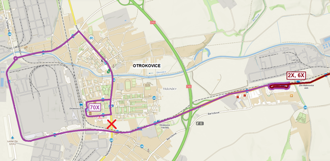 Trolejbusové linky č. 2 a 6 ze Zlína budou v době uzavírky přejezdu označeny jako 2X a 6X a budou zkráceny ze Zlína jen na obratiště Malenovice-Centro. Při jízdě do Otrokovic si cestující na zastávce Malenovice-Centro přestoupí na výlukovou autobusovou linku s označením 70X, kterou se se zpožděním 10 – 12 minut proti normálnímu provozu dostanou až k železniční stanici v Otrokovicích. Autobusy linky 70X zastaví na Trávníkách, Kvítkovicích-Zlínské, ne však na zastávkách Pneumatikárna, Teplárna, U Dřevnice, Nadjezd, Otrokovice-nám., pouze pro výstup zastaví na zastávce Havlíčkova. V opačném směru zastaví autobusy linky 70X na zastávce Otrokovice-žel. stanice, Dr. E. Beneše, Otrokovice-pošta a potom až na zastávkách Kvítkovice-Zlínská, Trávníky, Malenovice-obch. zóna.