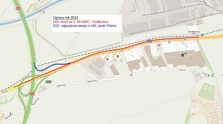 Práce budou probíhat v několika etapách. Od 3. do 10. dubna se také uzavře nájezdová rampa na dálnici D55 ve směru na Přerov. „Provoz na komunikaci I/49 bude veden kyvadlově. Opravu dokončíme v polovině května,“ informovalo Ředitelství silnic a dálnic.