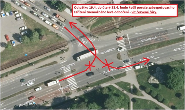 Kvůli technické poruše zařízení, které řídí provoz zabezpečovacího systému železničního přejezdu a světelné signalizace na sousední křižovatce, je od dnešního odpoledne pravděpodobně až do úterý 23. dubna zakázáno odbočování všech vozidel při jízdě z Prštného vlevo do centra Zlína a při jízdě od Otrokovic vlevo do Prštného. Dotýká se to pravidelné linky MHD hybridních trolejbusů č. 1 nebo 11 a autobusové linky školních spojů č. 92.