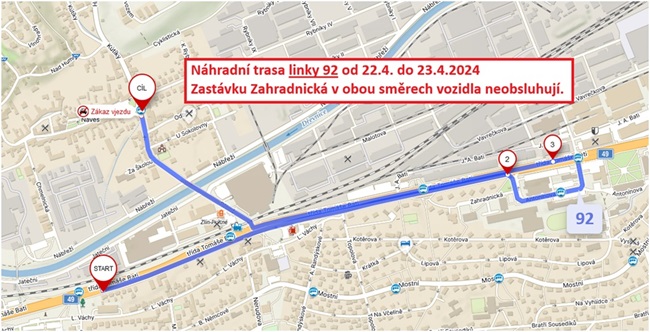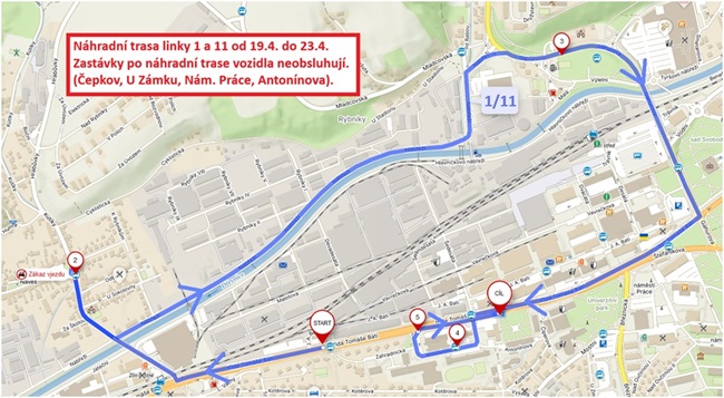 „Většinu trolejbusů na linkách 1 a 11 nahradíme autobusem. Z centra Zlína na točnu do Prštného pojede po standardní trase, zpátky ale jeho objízdná trasa povede ulicemi Nábřeží, Gahurova a Tomáše Bati na točnu Antonínova. Odtamtud budou spoje linek 1 nebo 11 pokračovat na zastávku Poliklinika a dál pojedou do Příluků již po své obvyklé trase, ale se zpožděním asi 10 minut,“ popsal vedoucí dispečer DSZO Jan Tesař. Na objízdné trase mezi Prštným a točnou Antonínova spoje linek 1 nebo 11 nebudou nikde zastavovat. Zastávku Zahradnická ve směru do centra Zlína linky č. 1 a 11 ve výlukovém provozu nebudou obsluhovat.