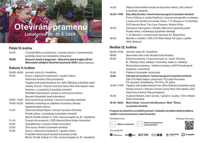 O velkolepé zahájení se na úvod postará Aneta Langerová. Sobota se poté ponese v prvorepublikovém duchu. „Pro všechny přítomné bude lákavá návštěva Tomáše Bati, který Luhačovice pravidelně navštěvoval, a T. G. Masaryka. Tito pánové se budou procházet po našem městě a určitě budou rádi konverzovat s kterýmkoliv z návštěvníků. Samozřejmostí je, že v neděli jdeme tradiční folklorní cestou, kdy nebude chybět samotné svěcení pramenů a tím vyzýváme, abychom měli opět bohaté prameny a Luhačovice byly tím, čím jsou. Plné pohody a lázeňství,“ láká starosta Luhačovic Marian Ležák.