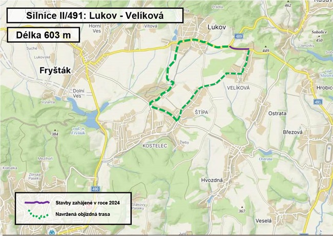 Stavení práce proběhnou za úplné uzavírky od 17. června do konce srpna. Objízdná trasa povede po silnicích II/489, III/49015, III/4915 a III/4912 přes Lukov, Štípu a Velíkovou.