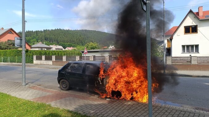 U Vsetína narazilo auto do sloupu a začalo hořet