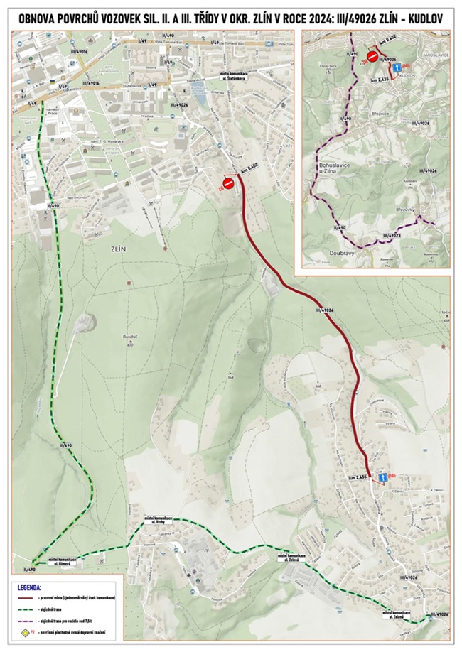 Práce proběhnou v několika etapách, přičemž silnice bude v každé z nich průjezdná pouze jedním jízdním pruhem. Objízdná trasa ve směru z Kudlova na Zlín povede po komunikacích ulic Zelená, Vrchy, Filmová, Březnická a na silnici I/49. V opačném směru bude silnice průjezdná.