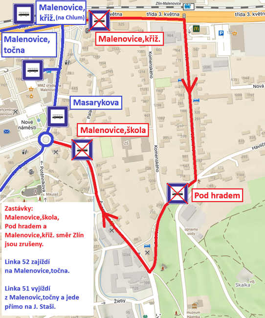 Kvůli uzavírce budou autobusy na lince č. 51 vynechávat zastávky Malenovice-křižovatka ve směru do Zlína, Pod Hradem a Malenovice-škola a pojedou přímo na zastávku J. Staši. Autobusy linky č. 52 (Lhotka, Chlum, Tečovice) budou zajíždět na zastávku Malenovice-točna místo na zastávku Malenovice-křižovatka.