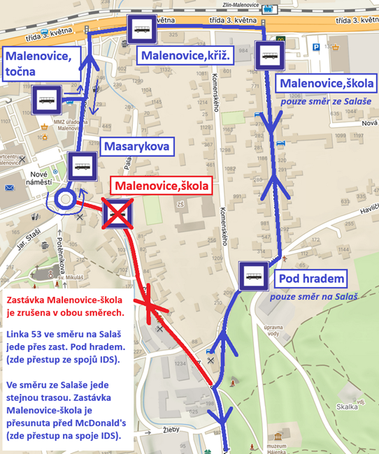 Na lince č. 53 Salaš pojedou autobusy v obou směrech ulicí I. Veselkové. Ve směru jízdy na Salaš bude na lince 53 zastávka Pod Hradem, kde bude vytvořena možnost přestupů ze spojů IDZK. Ve směru jízdy od Salaše zastaví autobusy linky 53 na provizorní zastávce u McDonald’s (přesun zastávky Malenovice-škola), kde se rovněž počítá s možností přestupů na spoje IDZK.
