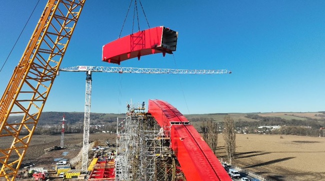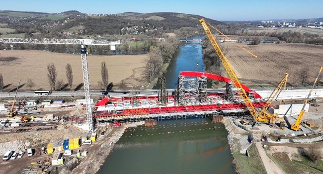 ZLÍNSKO – Silničáři začali osazovat ocelový oblouk na stavbě dálničního mostu přes řeku Moravu u Napajedel. Řidiči se po něm poprvé projedou už koncem roku.