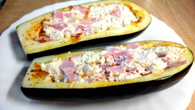 Jemně nastrouhanou (případně lžičkou rozdrcenou) Nivu dáme do misky a smícháme se smetanovým sýrem a několika lžícemi zakysané smetany, která dodá krémovou konzistenci. Dále přidáme na kousky nakrájenou šunku, vydlabanou dužninu lilku nakrájenou na malé kousky nebo nastrouhanou najemno a náplň dochutíme. Je-li příliš řídká, můžeme zahustit trochou jemných ovesných vloček. (V malém množství se v pokrmu naprosto ztratí.)