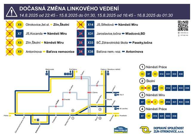 Poslední spoj na lince 6, který pojede v pátek 15. srpna po své pravidelné trase na Jižní Svahy, točnu Kocanda, odjede od železniční stanice v Otrokovicích v 15:45. Zpátky z točny Kocanda pojede poslední šestka do Otrokovic v 16:17, poslední osmička z Kocandy v 16:19 (kolem nemocnice na Náměstí Míru a dále jako linka X7). Z točny Středová pojede poslední pravidelná devítka v 16:20 (kolem nemocnice na Náměstí Míru a dále jako linka X14).