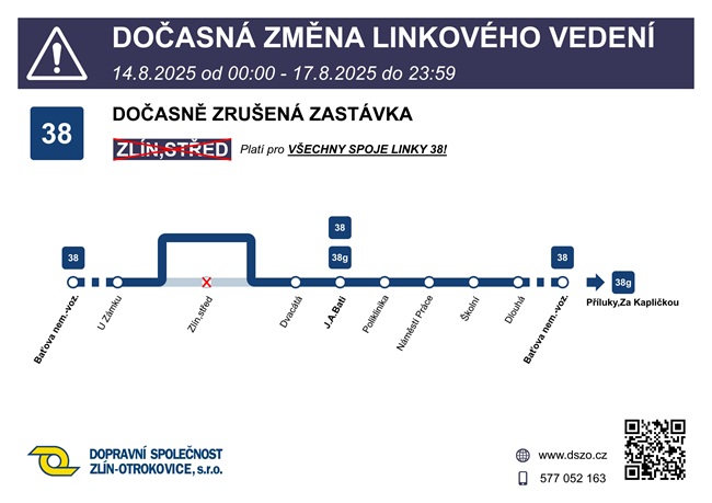 Od čtvrtku 14. srpna 2025 do neděle 17. srpna 2025 budou všechny spoje autobusové linky č. 38 vynechávat zastávku Zlín-střed. Všechny spoje tak pojedou ze zastávky U Zámku přímo na zastávku Dvacátá, odkud odjedou v čase odjezdu standardního jízdního řádu.