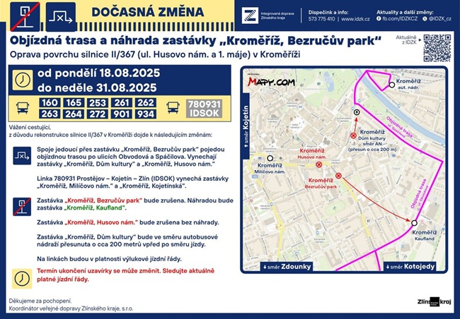Omezení čekají i veřejnou dopravu. Linky, které obsluhují zastávku Kroměříž, Bezručův park, pojedou objízdnou trasou po ulicích Obvodová a Spáčilova, a to v obou směrech. Zastávka Kroměříž, Bezručův park bude dočasně přemístěna do místa stávající zastávky Kroměříž, Kaufland. Co se MHD týče, po dobu uzavírky bude zrušena zastávka Bezručův park a Husovo náměstí, zastávka Dům kultury bude přesunuta na ulici Tovačovského před budovy Komerční banky.