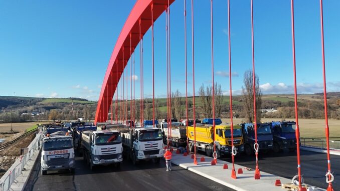 ZLÍNSKO – Dálniční most u Napajedel dnes prochází klíčovou zatěžovací zkouškou. ŘSD ověřuje jeho únosnost pomocí 18 plně naložených kamionů o celkové hmotnosti 576 tun. Most má být podle plánů otevřen motoristům 9. prosince.