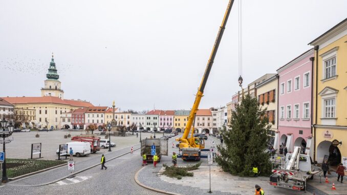 KROMĚŘÍŽ – Kroměřížský vánoční strom je od dnešního dopoledne na svém místě v horní části Velkého náměstí před budovou radnice. Asi jedenáct metrů vysoký smrk ztepilý rostl v areálu dopravní společnosti v místní části Vážany. „V minulém roce zdobil náměstí také smrk ztepilý z areálu stejné firmy. Rád bych poděkoval majitelům za to, že i letos městu strom jako ozdobu vánočních svátků věnovali,“ uvedl starosta Tomáš Opatrný.