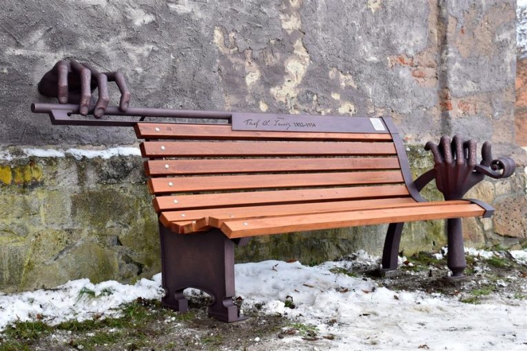 Lavička s artefaktem věnovaná Otakaru Ševčíkovi (zdroj mesto-pisek.cz)