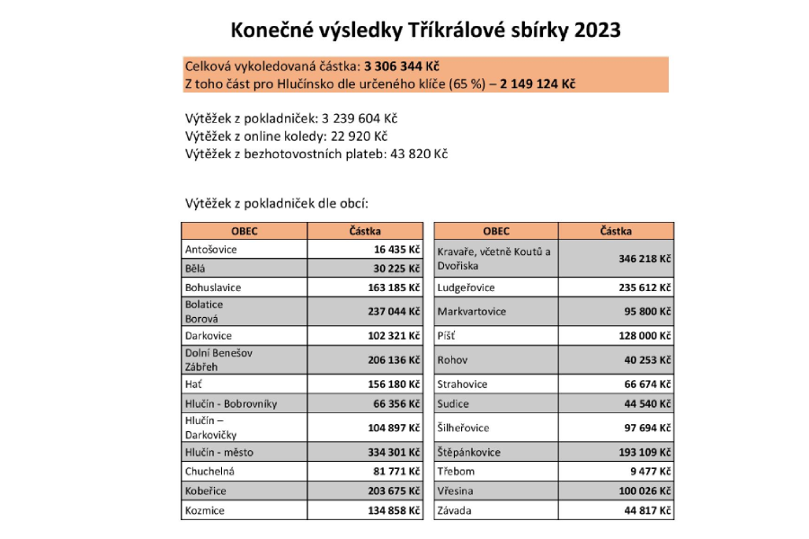 Celkem se koledníkům, podařilo vykoledovat neuvěřitelných 3.306.344 Kč! Podle stanovených pravidel sbírky zůstane 65 % výtěžku, tedy přes 2 mil. Kč, na Hlučínsku. „Chci z celého srdce poděkovat všem. Celkový výtěžek na malém území Hlučínska je neuvěřitelný a potvrzuje, že žijeme v regionu, kde je pojem solidarita důležitou hodnotou,“ řekl ředitel Charity Hlučín Pavel Sobol.