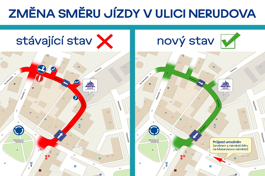 „Centra města se dotknout změny v dopravě. Řidiči by zejména v příštím týdnu měli zvýšit svou obezřetnost a dbát nového dopravního značení,“ říká místostarosta Tomáš Gross. Do ulice Nerudova se nyní bude najíždět z ulice Palackého, řidiči projedou kolem hotelu AHG a ČSOB na Masarykovo náměstí. Současně se opět otevře průjezd kolem pošty, tedy z náměstí Míru na hlavní rožnovské náměstí. Doposud byl provoz dopravy na ulici Nerudova v opačném směru a průjezd na náměstí od pošty byl uzavřen. Město doufá, že tyto změny ocení nejen občané, ale i firmy, které se setkávaly s problémy při zásobování svých prodejen. Chvilku potrvá, než si řidiči zvyknou na změny, proto je nutná ostražitost a sledování dopravního značení.