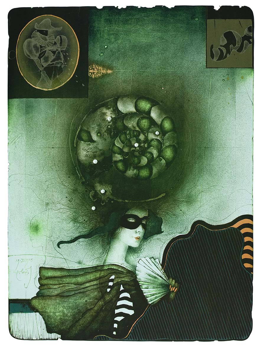 Barevné litografie z let 1983–2019 přenášejí diváka do světa fantazie a iluze, světa ovládaného zvláštní nostalgií, ve kterém si umělec pohrává s metaforou a symbolem. Typickým námětem jeho obrazů je ženská figura, chápaná jako symbol bytosti zranitelné a křehké, současně však i silné a plné emocí. Tyto elegantní a tajuplné postavy se zpravidla pohybují kdesi na hraně snu a skutečnosti. Pocit vytržení z prostoru a času podtrhují záměrně použité atributy – masky, vějíře, škrabošky nebo ulity, stáčející se do nekonečných fantastických spirál. Kromě barevných litografií je zde poprvé vystaveno i devět neznámých akrylových obrazů z 90. let minulého století.