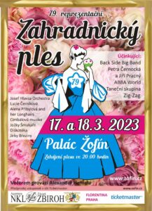 Zahradnický ples přivítá hosty v pátek 17. března od 20 hodin a v sobotu 18. března taktéž v 20 hodin ve slavnostně nasvíceném paláci Žofín. Záplava květin, zajímaví hosté, vynikající vystupující umělci a hlavně příjemná atmosféra jsou atributy tradičního Zahradnického plesu. K tanci bude hrát Back Side Big Band, ABBA World Revival a Josef Hlavsa Orchestra. Těšit se můžete na vystoupení Petry Černocké a Jiřího Pracného, Lucii Černíkovou, Alenu Přibylovou and her Longhairs a taneční vystoupení skupiny Zig – Zag. Během večera také zahraje Cimbálová muzika Jožky Šmukaře a dýdžej Jirka Březina.