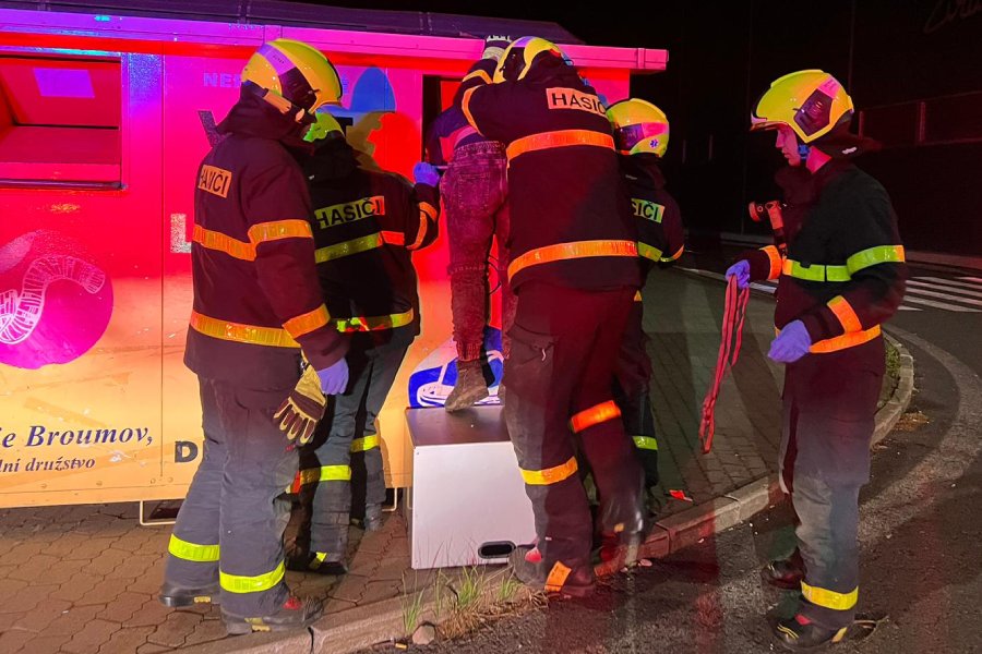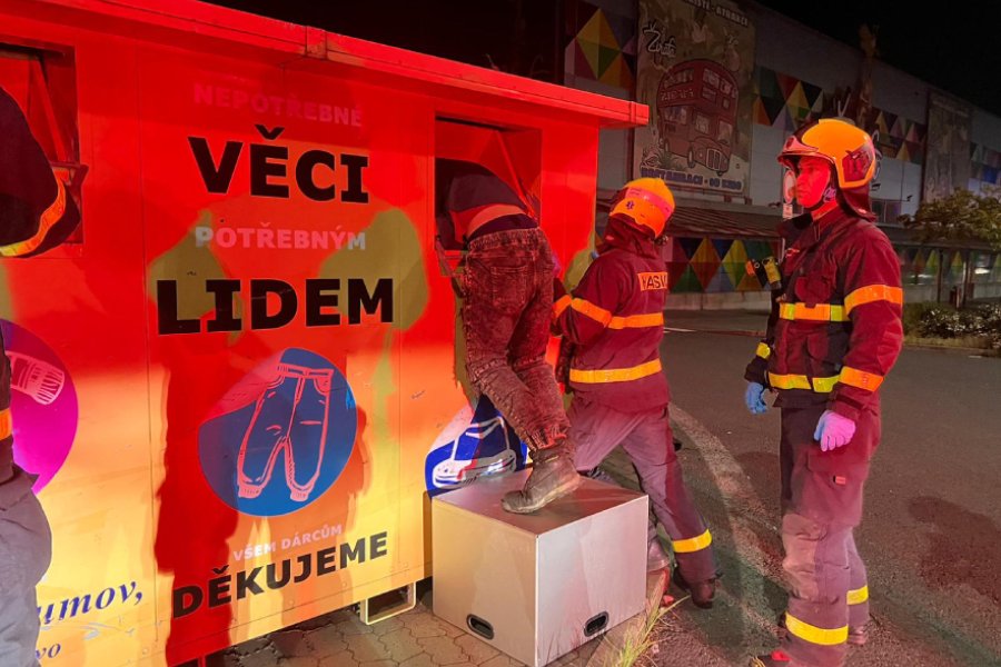 Podle mluvčí policie Evy Michalíkové v kontejneru uvízl čtyřicetiletý muž bez domova. „Jak svědkyně uvedla, muž měl část těla uvnitř kontejneru a volal o pomoc. Ihned na místo zavolala hasiče,“ doplnila Michalíková. Případ kriminalisté vyšetřují jako podezření z trestného činu ublížení na zdraví.
