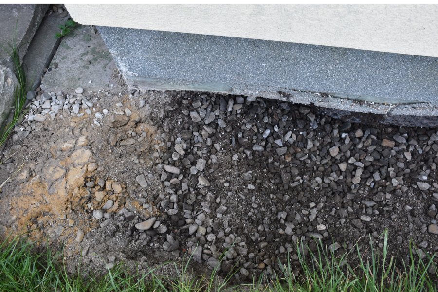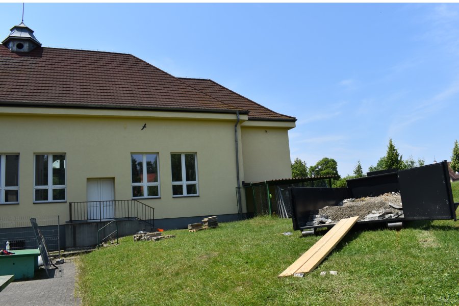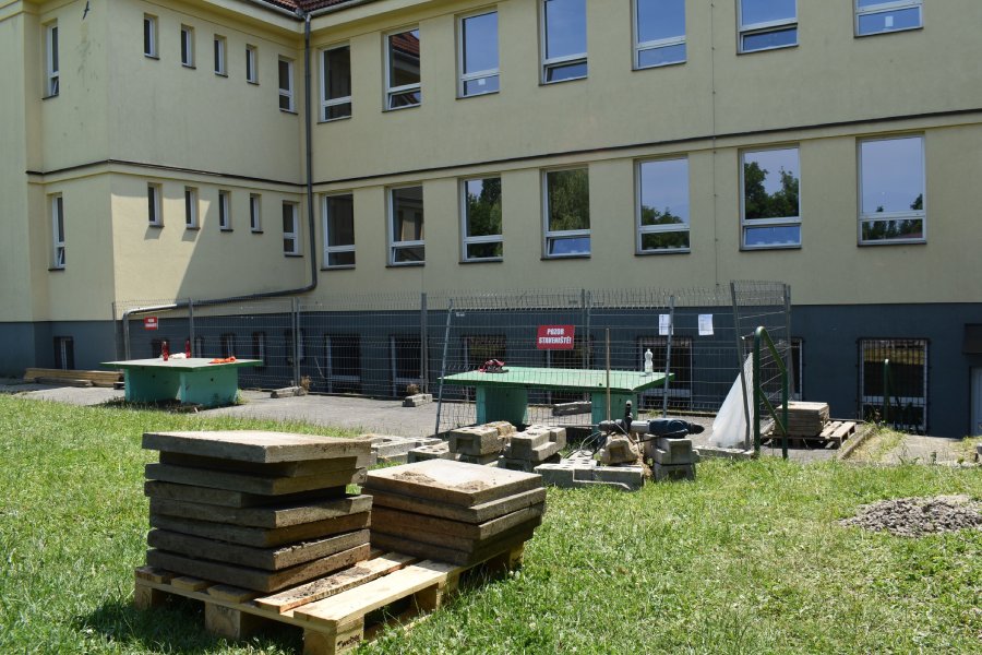 Řemeslníci upraví plochy v okolí budovy. Srážková voda tak odteče do bezpečné vzdálenosti od obvodových suterénních stěn. Práce potrvají až do poloviny září 2023.