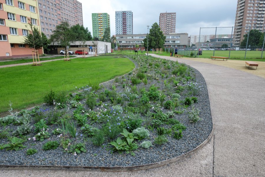 OSTRAVA – Hrabůvka je zase o něco hezčí. Parková plocha u polikliniky se z nevzhledného prostoru proměnila v klidovou zónu, které dominuje unikátní vodní plocha s lehacími platy ze dřeva.