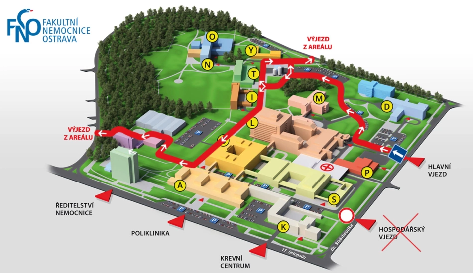 S dopravním omezením je zapotřebí počítat od 12. do 16. června. Do areálu nemocnice bude možné vjíždět pouze jediným vjezdem, a to hlavním vjezdem z ulice. Dr. Slabihoudka. Výjezd nebude možný. Řidiči budou moci z nemocnice vyjet dvěma způsoby: První možnost je jet po komunikaci u pavilonu Y, nebo po cestě kolem pavilonu C. Hospodářský výjezd bude uzavřený pro všechna vozidla. „Řidičům pomohou v orientaci informační cedule s dopravním značením a na klíčových místech areálu budou dopravu usměrňovat pracovníci ostrahy Fakultní nemocnice v Ostravě,“ sdělilo zdravotnické zařízení na svých webových stránkách. Vzhledem k dopravním omezením v uvedených 5 dnech nemocnice vyzvala řidiče, aby zvážili nezbytnost vjezdu do areálu.
