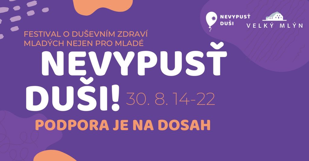 PRAHA – V pátek 30. srpna se ve Velkém mlýně v Praze 8 – Libni koná festival Nevypusť duši!, kde se bude mluvit o duševním zdraví dětí a mladých. Od 14 do 22 vás čeká spousta zajímavých přednášek, workshopů a aktivit, které se točí kolem toho, jak pečovat o duševní pohodu.