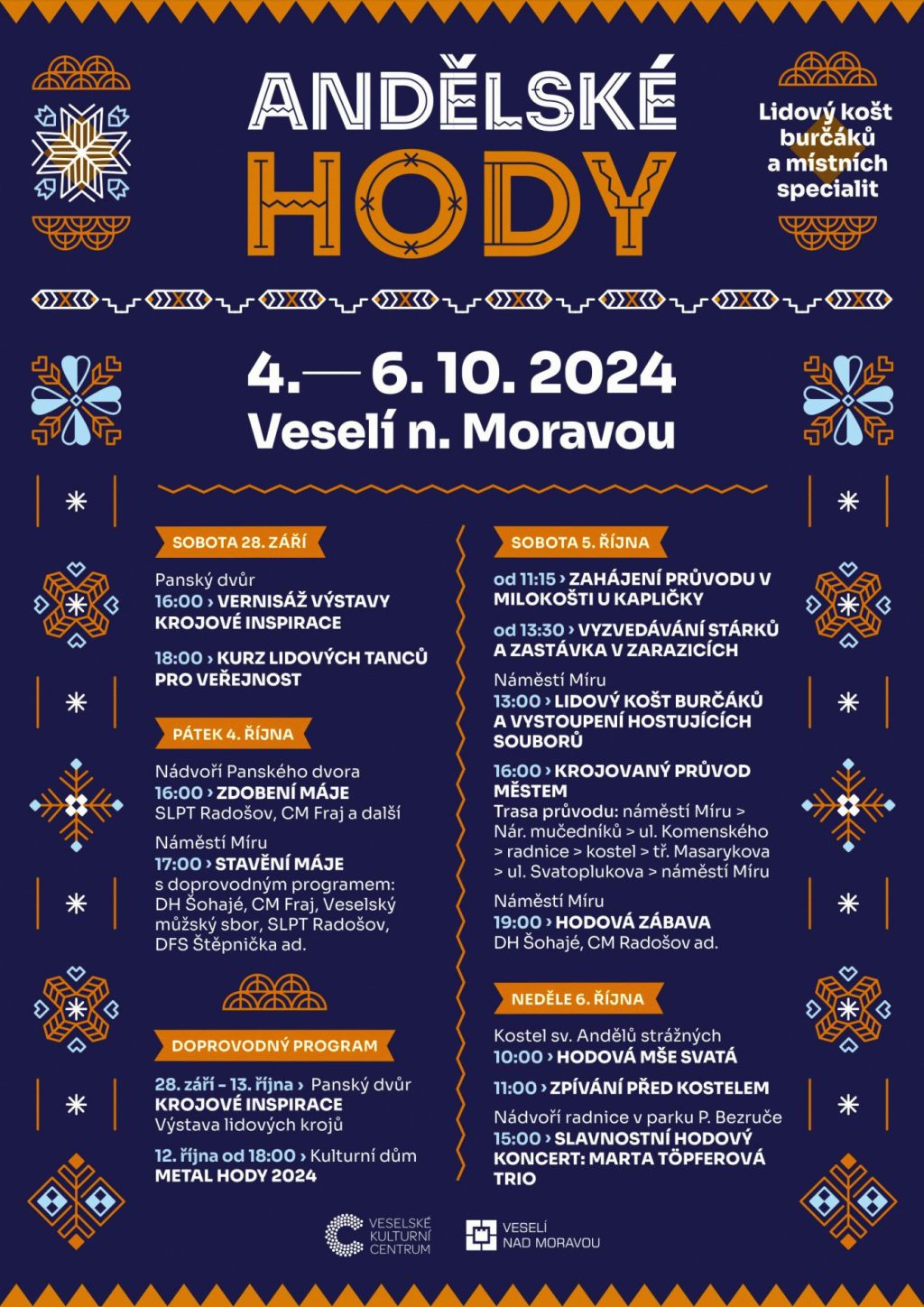 Město Veselí nad Moravou od pátku 4. do neděle 6. října ožije Andělskými hody, jejichž tvářemi se pro letošní rok stali mladší stárci Eva Tomčalová a Vojtěch Kolář a starší stárci Barbora Šrahůlková a Petr Sobek. V pátek od 15:30 hodin proběhne Vernisáž výstavy Svět nevídaný. Vernisáž se koná před Panským dvorem, kde budou umístěny outdoorové bloky. Od 16 hodin začne chasa se zdobením máje a následně upevní tento symbol hodů na náměstí Míru. Na pódiu mezitím zahraje dechovka Šohajé nebo cimbálová muzika Fraj.