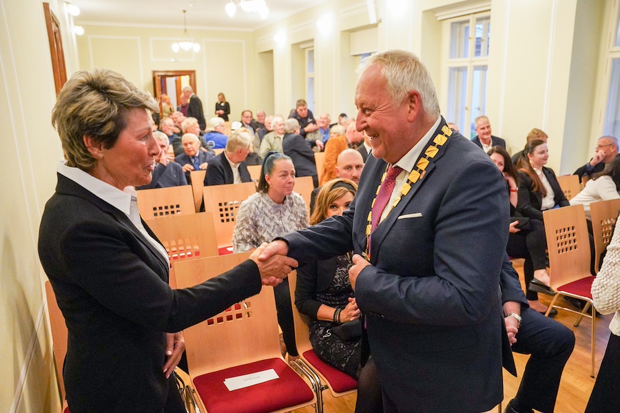 Foto Město Liberec – Za Břetislava Engeho ocenění převzala z rukou primátora Liberce Jaroslava Zámečníka vdova Radoslava Engová.