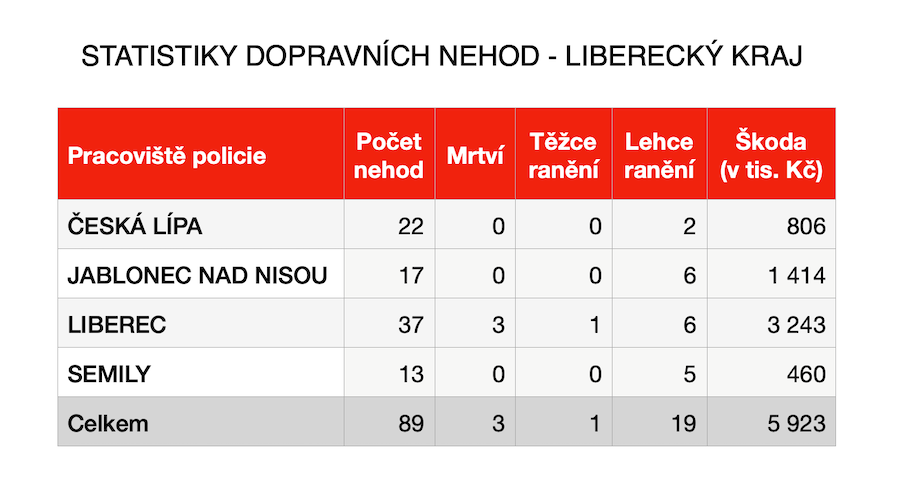V uplynulém týdnu vyhasly na silnicích v kraji tři lidské životy – všechny v okrese Liberec. Dva lidé zemřeli podle policie v sobotu, jedné osobě se stala osudnou nehoda ve čtvrtek. Pokud jde o vzniklé škody, vyčíslila je policie na bezmála šest milionů korun. A pokud vás zajímá, kde byly v minulém týdnu škody nejvyšší a kolik nehod se v jakém okrese stalo, podívejte se na údaje v tabulce níže.