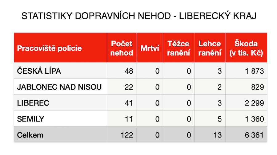 Z policejních statistik dále vyplývá, že se nejvíce nehod stalo v okrese Česká Lípa (48), naopak nejméně v okrese Semily (11). Jako nejčastější příčinu nehod uvádí policie nesprávný způsob jízdy (63), nepřiměřenou rychlost (19) a nedání přednosti (8).