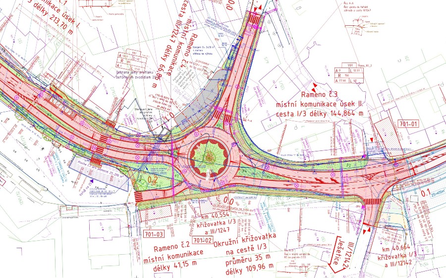 Nový kruhový objezd bude mít vnější průměr 35 metrů a napojí se na něj celkem čtyři větve. Součástí projektu bude také rekonstrukce přilehlých úseků silnice I/3 v délce zhruba 344 metrů. Dále se upraví místní komunikace, dojde k výměně veřejného osvětlení a obnoví se chodníky, které budou opatřené prvky pro nevidomé a bezbariérové úpravy. „Plánujeme také rekonstrukci parkovacích ploch a výsadbu nové zeleně včetně několika stromů,“ dodává Veselý.