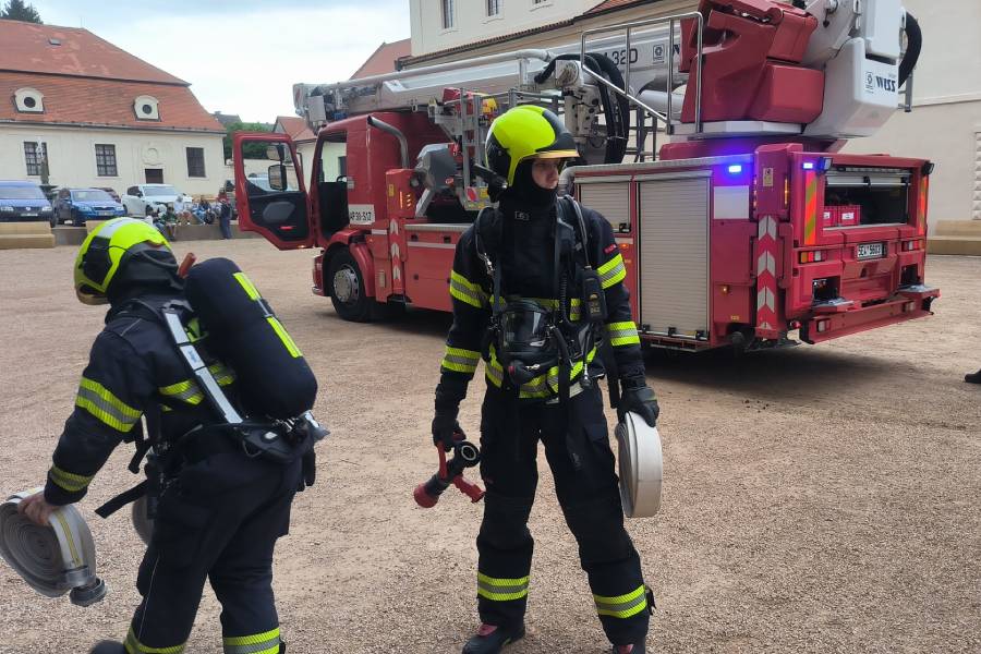 LITOMYŠL – Hasiči trénovali likvidaci požáru na zámku v Litomyšli. Při koncertě Smetanova Litomyšl mělo začít hořet kvůli technické závadě na aparatuře.