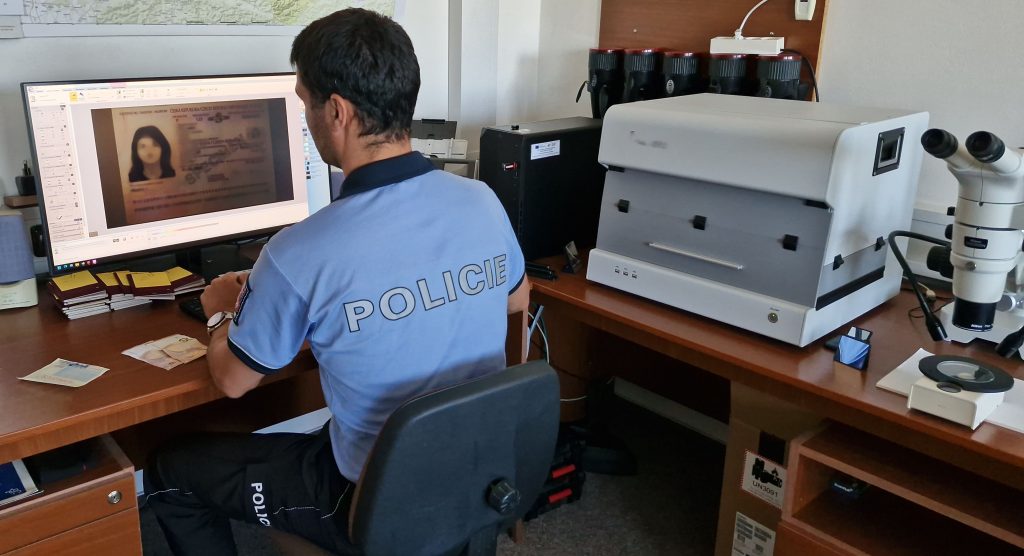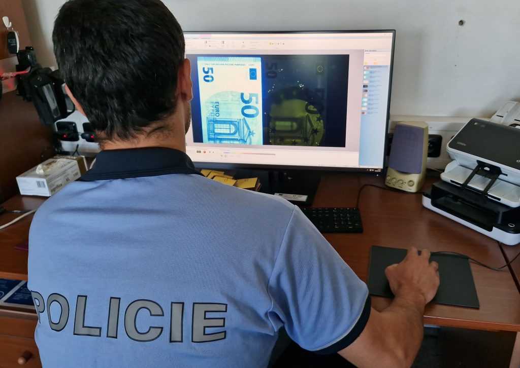 Policista pracuje s komparátorem na odhalení padělků. Fotky: PČR