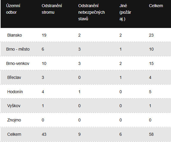 Nejvíce zásahů bylo v okresech Blansko, Brno-venkov a Brno-město. Hasiči řešili především popadané stromy, které komplikovaly dopravu a v Brně dokonce poškodily zaparkovaná auta. Časté byly i zásahy u uvolněných částí střech, zejména plechových krytin, které hrozily pádem. V několika případech vítr zkomplikoval i hašení požárů, které se šířily velmi rychle. Škody zaznamenali také ve Šlapanicích a Bedřichově, kde vítr poškodil slavnostní májku. Přes vysoký počet zásahů se však celá situace obešla bez zranění osob,” konstatoval mluvčí  hasičů Štěpán Komosný.