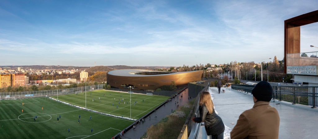Návrh střechy ve tvaru hyperbolického paraboloidu se harmonicky propojuje s fasádou a vytváří jednotný celek, který působí výrazně i při pohledu z větší dálky. Důležité je, že profil střechy vytváří uzavřenou arénu, která pomáhá fanouškům vytvářet atmosféru tím, že koncentruje a udržuje hluk a energii davu uvnitř. Na jihovýchodní a jihozápadní straně jsou umístěné dvě fanzóny, které nabízejí fanouškům možnost volby podle směru, odkud přicházejí. V současnosti jsou náklady odhadované na 2,5 miliardy korun a v dalších stupních projektové přípravy budou zpřesňovány.