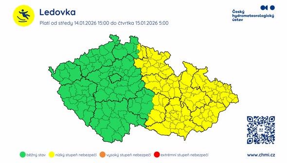 „Během středečního odpoledne očekáváme od severozápadu přibývání deště, který bude zejména ve východní polovině území místy mrznoucí s tvorbou slabé ledovky,“ uvedl ČHMÚ. Výstraha s nízkým stupněm nebezpečí platí od středečních 15:00 do čtvrtečních 13:00. Během středečního odpoledne se očekává od severozápadu přibývání deště, který bude zejména ve východní části kraje místy mrznoucí s tvorbou slabé ledovky. V místech s ledovkou je nebezpečí úrazů při chůzi, problémů v dopravě a zvýšené nehodovosti.
