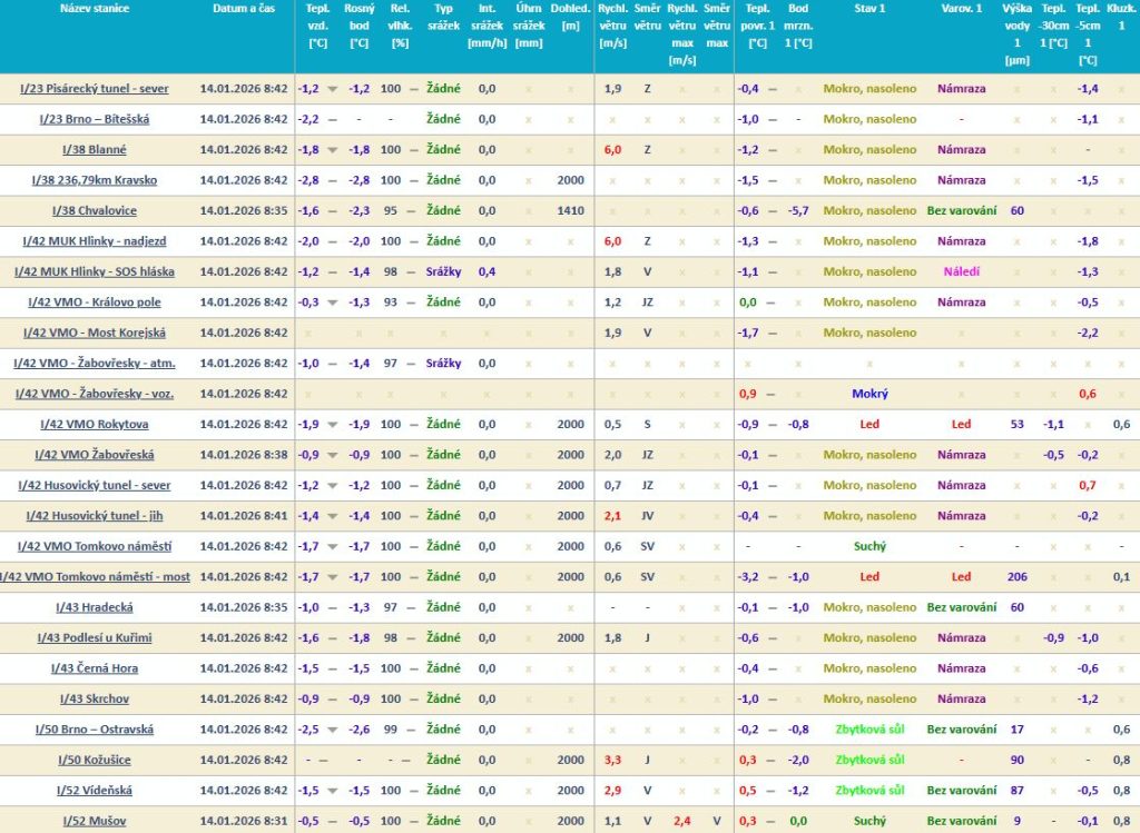 „Dálnice a silnice I. třídy v kraji jsou mokré a chemicky ošetřené. Riziko vzniku námrazy a náledí platí pro silnice I. třídy, viz tabulku. Zvýšenou opatrnost doporučujeme na VMO v Brně-Tomkovo náměstí a silnic I/43 a I/55. Stav vozovek stále sledujeme a dle potřeby je ošetřujeme,” uvedlo ŘSD na síti X.