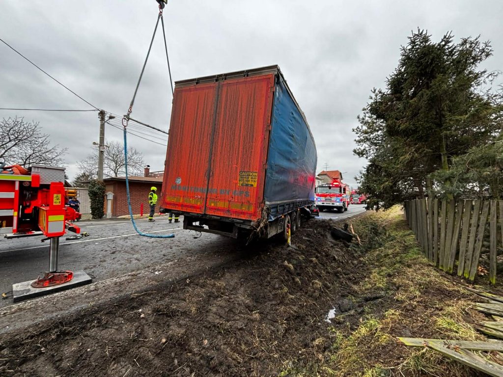 Na místě nehody zasahovali hasiči z Krnova. „K odstranění následků nehody a za účelem znovu zprůjezdnění komunikace jsme k zásahu povolali také speciální vyprošťovací automobil ze stanice v Bruntále. Pomocí této těžké techniky jsme kamion vyprostili zpět na vozovku,“ sdělila za hasiče mluvčí Kamila Langerová.
