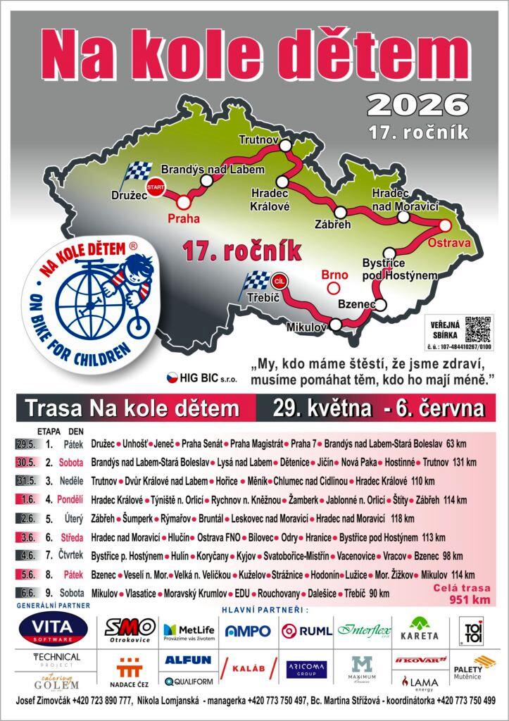 „Do dobročinného projektu se přitom může zapojit každý, ať už aktivní účastí v pelotonu, nebo příspěvkem do veřejné sbírky. Více informací najdete na webových stránkách www.nakoledetem.cz. Díky, že s námi pomáháte,” uvedlo město Vracov.