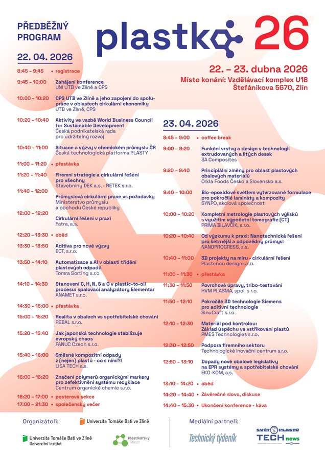 „Během dvou dnů se uskuteční celá řada velmi zajímavých přednášek představující novinky a trendy plastikářského sektoru. Hovořit se bude také o výsledcích výzkumu a vývoje vědecké i komerční sféry. Letos jsme pro účastníky připravili rovněž bohatý doprovodný program,“ pozval ředitel Centra polymerních systémů zlínské univerzity Vladimír Sedlařík.