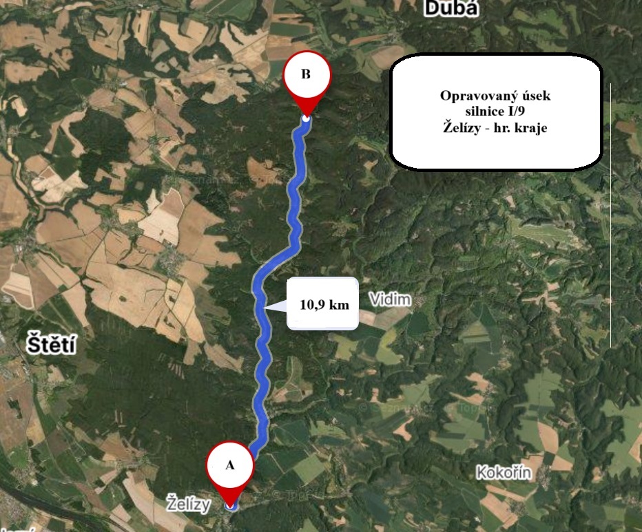 ŽELÍZY – Na důležité silnici I/9 mezi Želízy a hranicí Středočeského kraje se po zimní pauze znovu rozjíždí práce. Oprava téměř jedenáctikilometrového úseku pokračuje od 1. dubna a potrvá několik měsíců.